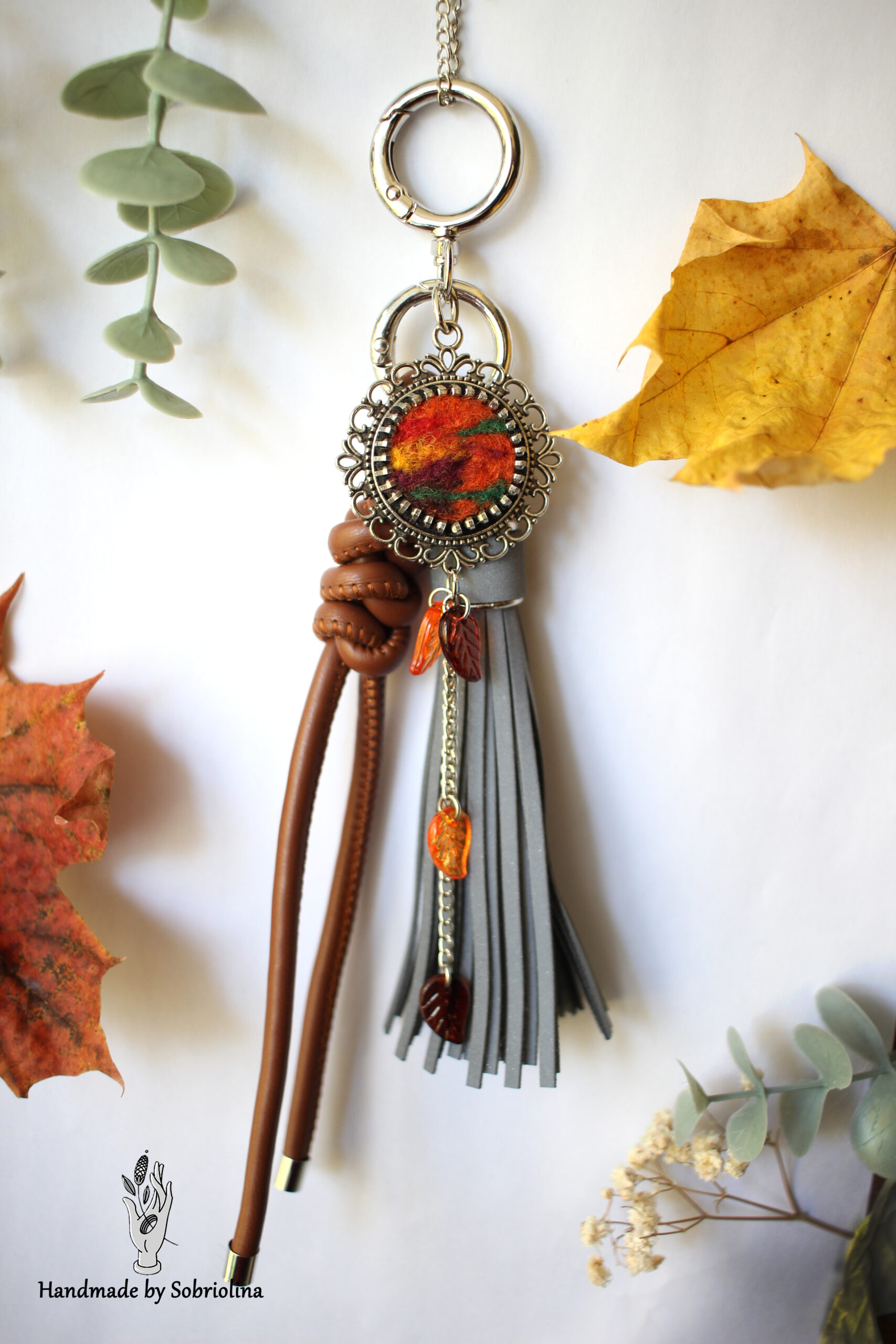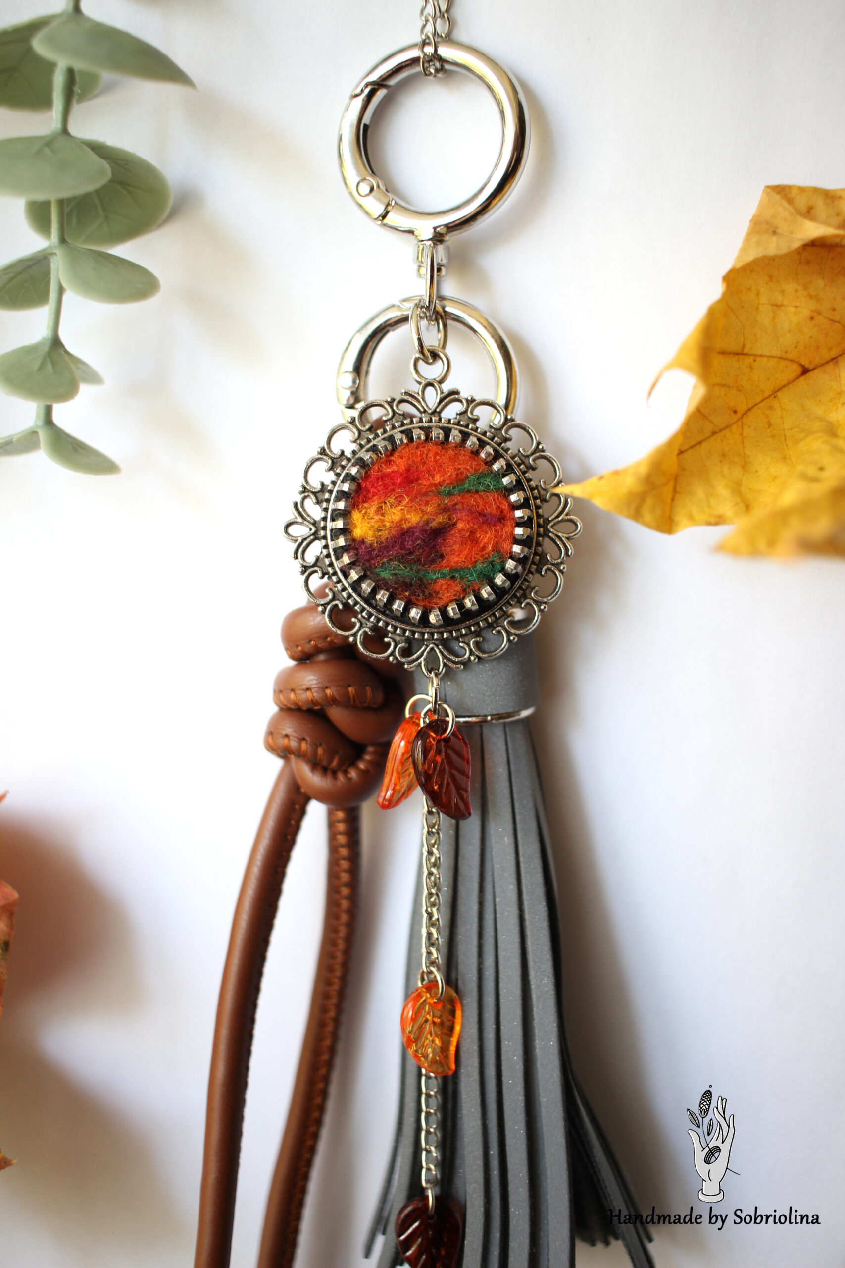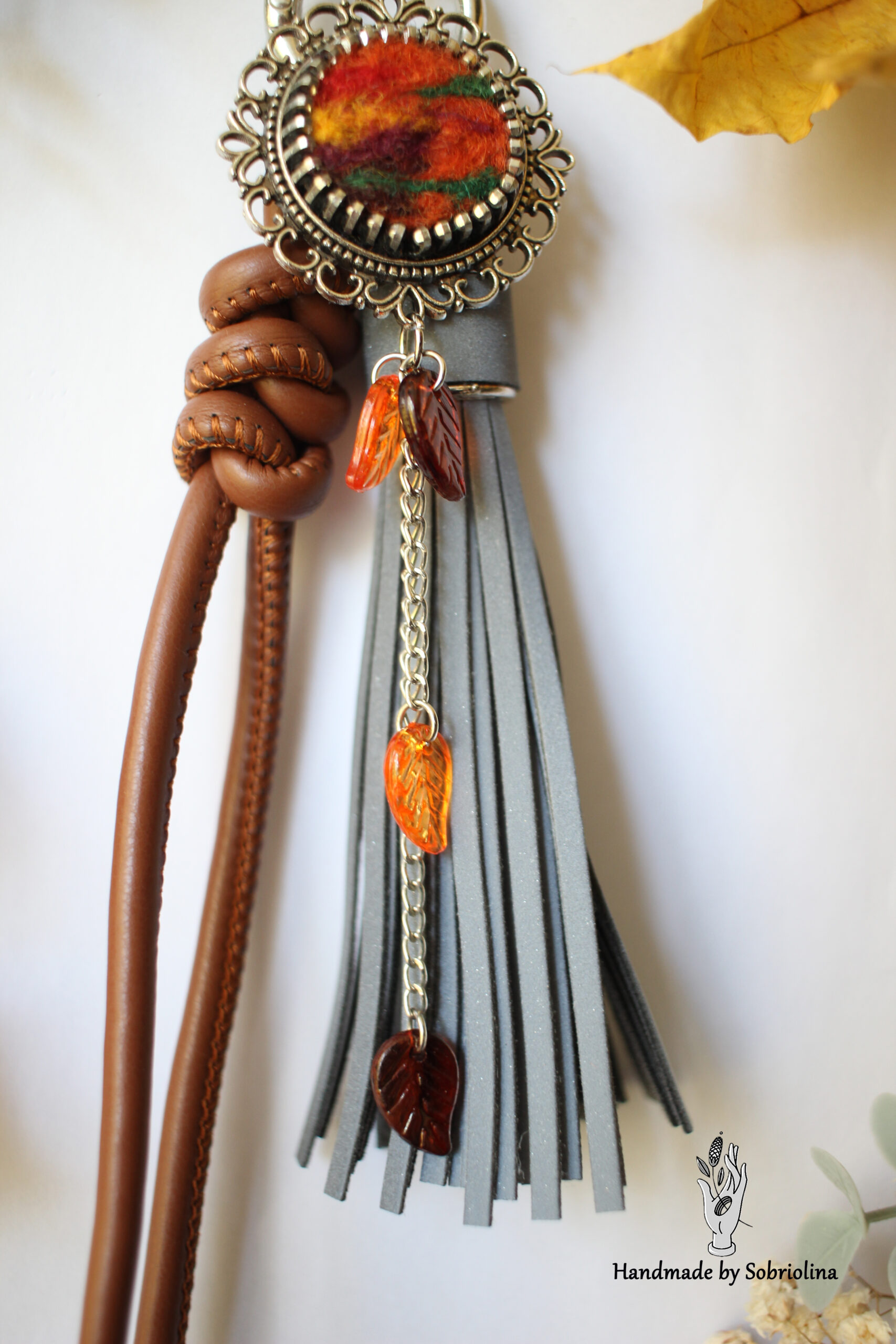 Atšvaitas dekoruotas veltinio mini rudens paveikslėliu, įrėmintu puošniu metalo elementu. Papildytas šviesą atspindinčiu kutu, elegantišku dirželiu ir rudeninėmis detalėmis – plastikiniais lapeliais bei pakabučiais.