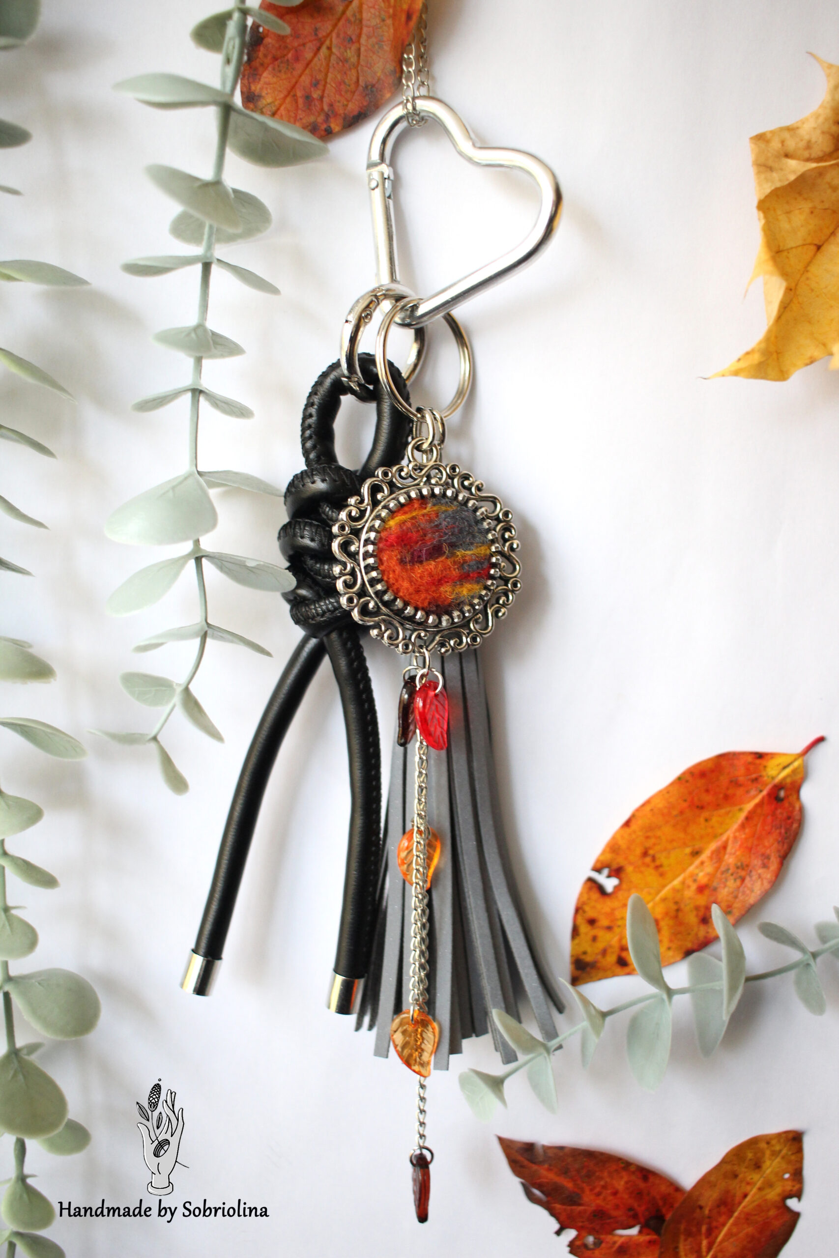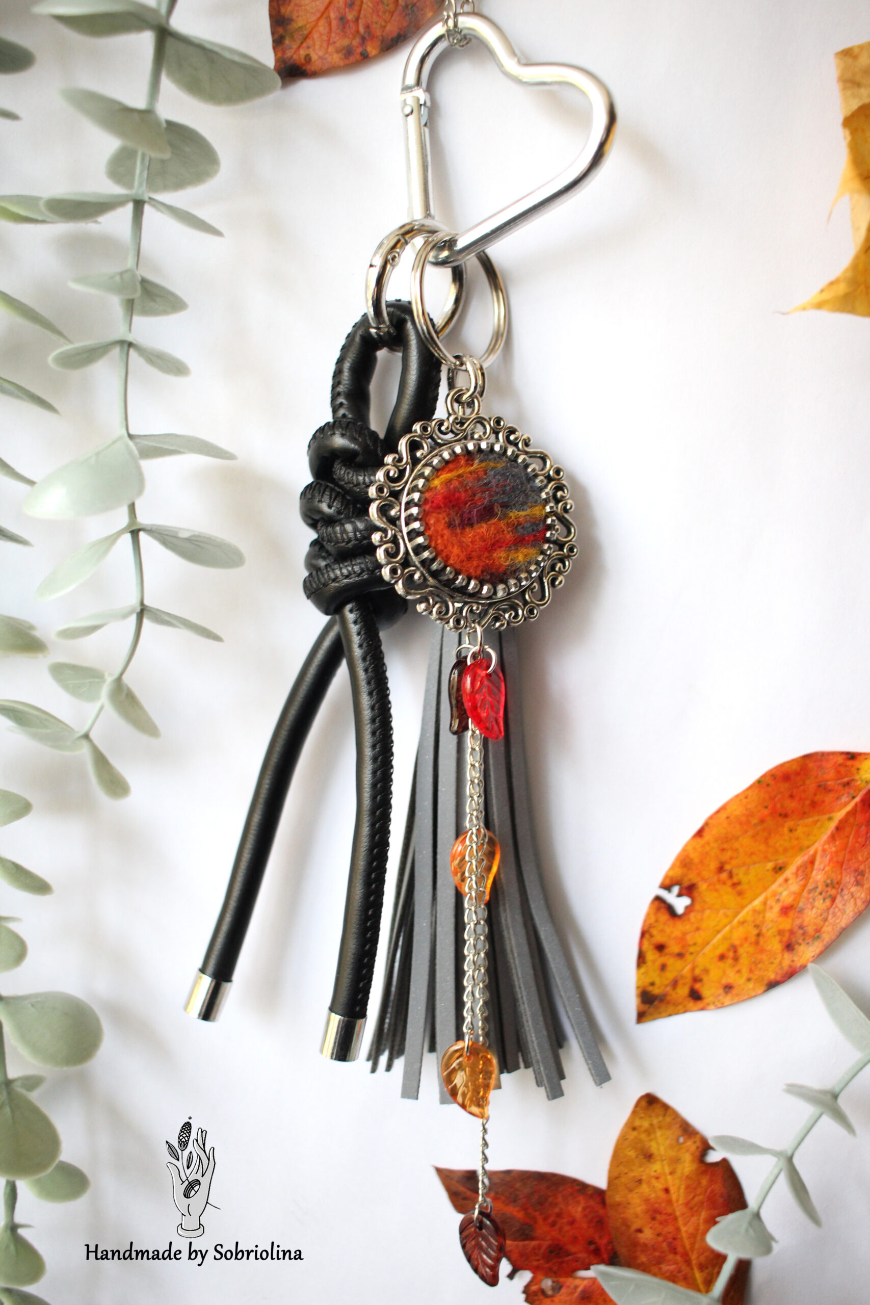 Atšvaitas dekoruotas veltinio mini rudens paveikslėliu, įrėmintu puošniu metalo elementu. Papildytas šviesą atspindinčiu kutu, elegantišku dirželiu ir rudeninėmis detalėmis – plastikiniais lapeliais bei pakabučiais.