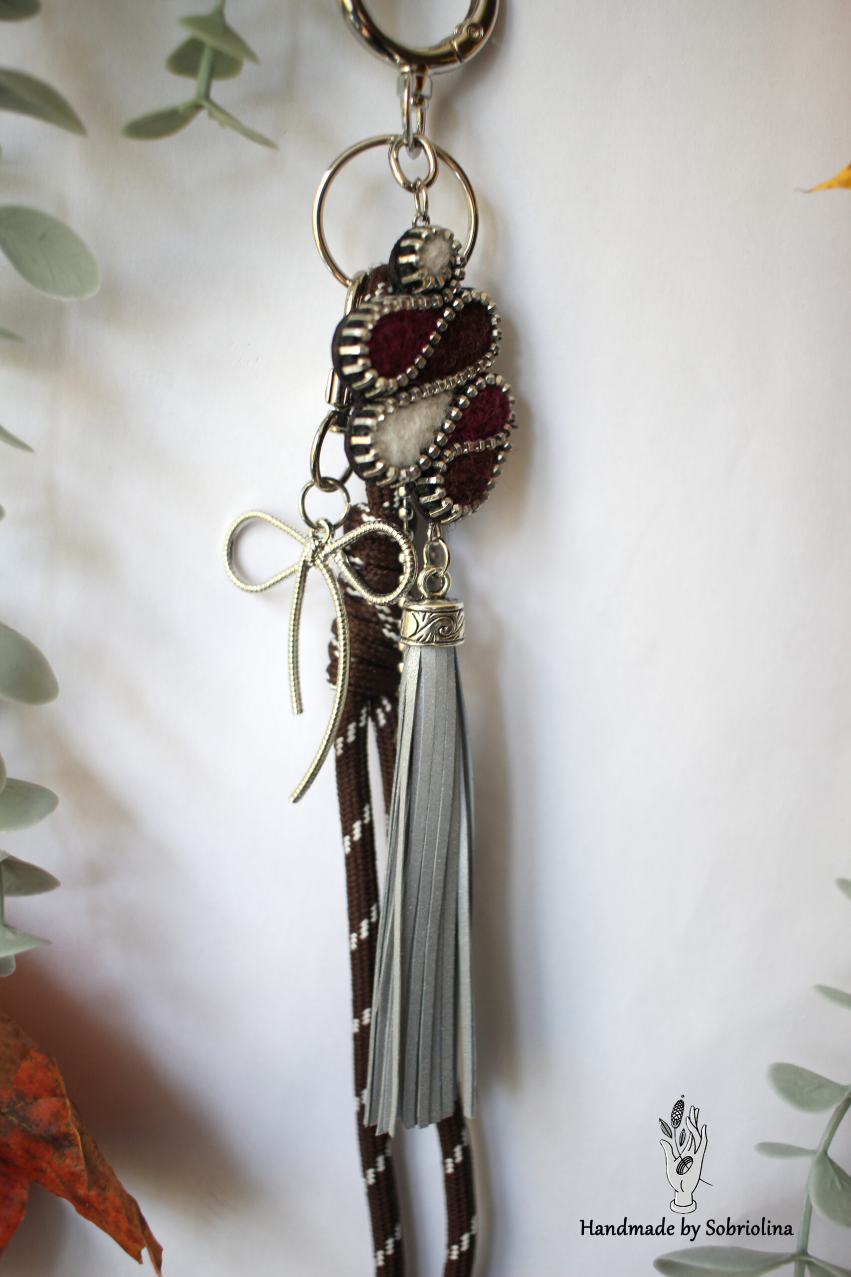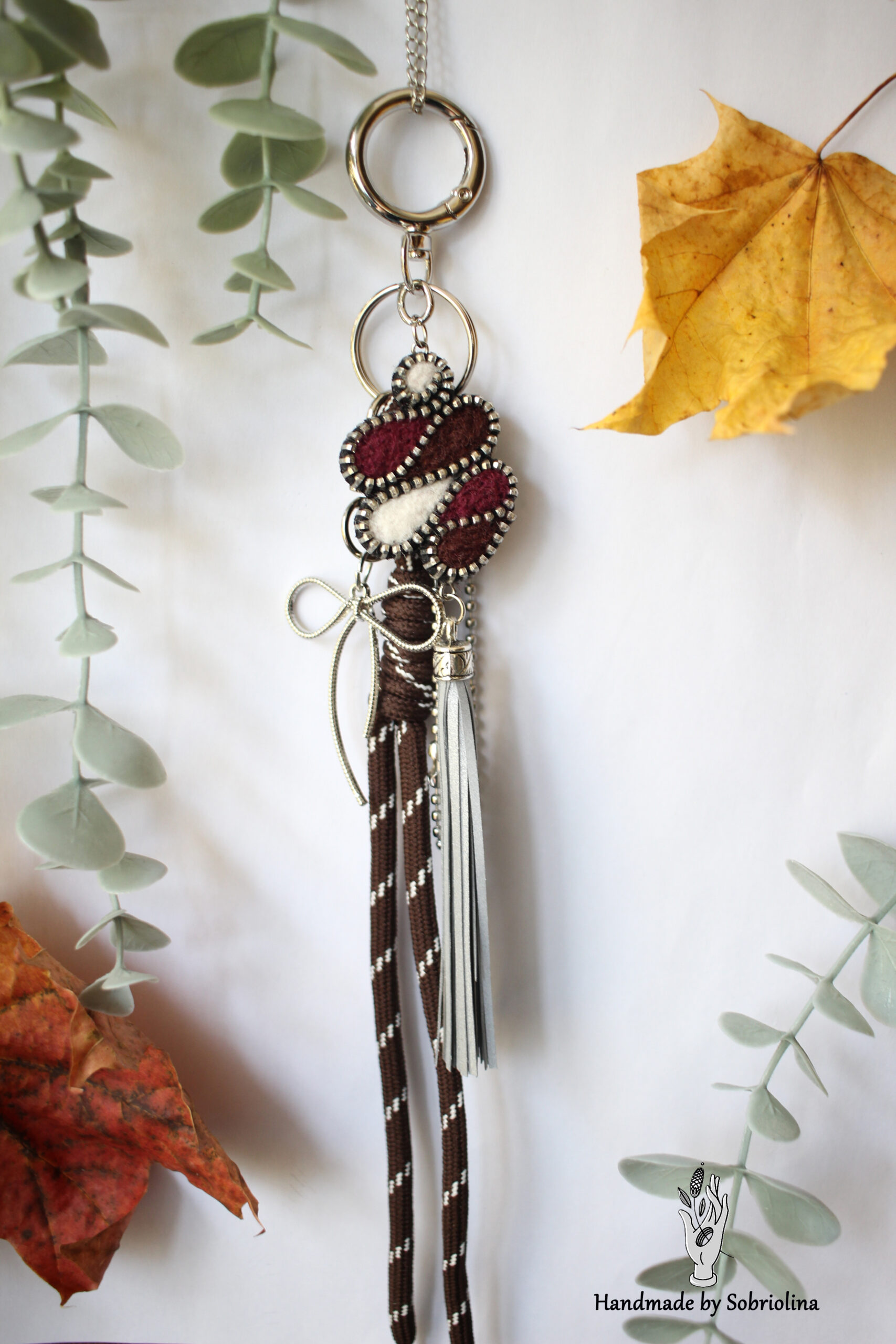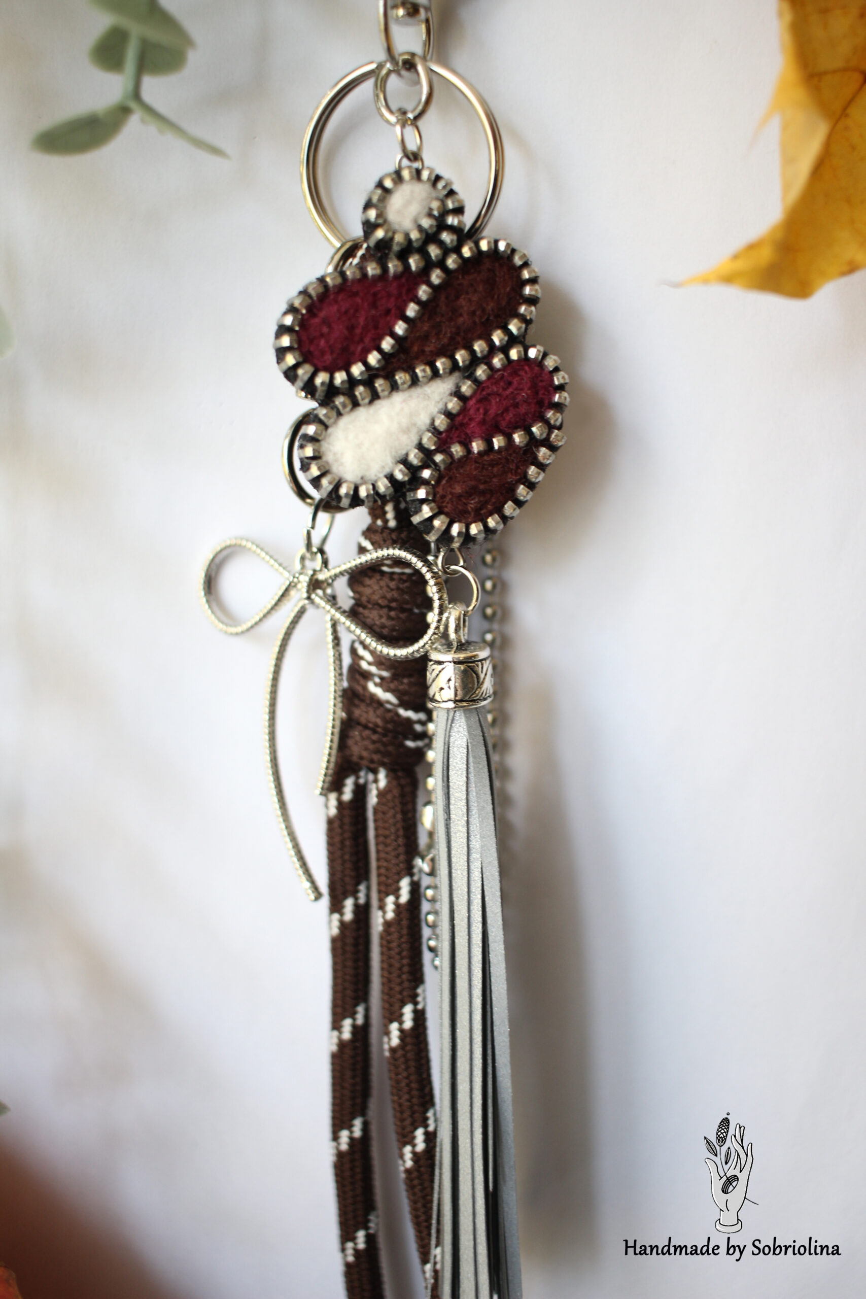 Pagamintas iš rankų velto veltinio rudų, baltu ir tamsiai vyšnių atspalvių, dekoruotas sidabro spalvos užtrauktuku ir pilku šviesą atspindinčiu kutu. Švelnus kontrastas tarp šokolado tonų ir šviesių detalių suteikia aksesuarui išskirtinio žavesio.